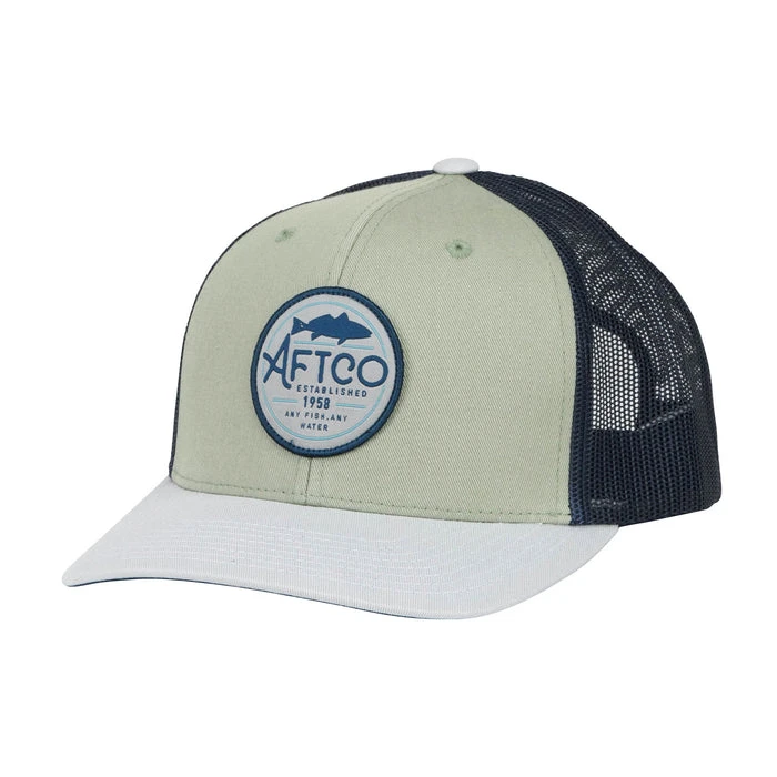 The Trooper is a 6 panel structured fishing trucker hat made of a polyester cotton twill material. The snapback provides an adjustable fit that appeals to most sizes and features an AFTCO patch on the front.